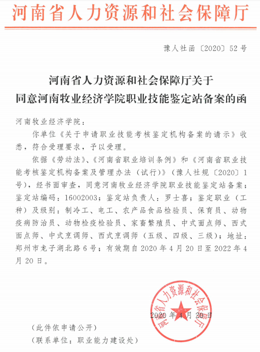 近日,河南省人力资源社会保障厅在回复给我校的函中显示,ok138cn太阳集团职业技能鉴定站顺利通过备案。鉴定职业(工种)及级别有制冷工、电工、农产品食品检验员、保育员、动物疫病防治员、家畜繁殖员、中式面点师、西式面点师、中式烹调师、西式烹调师(五级、四级、三级)。