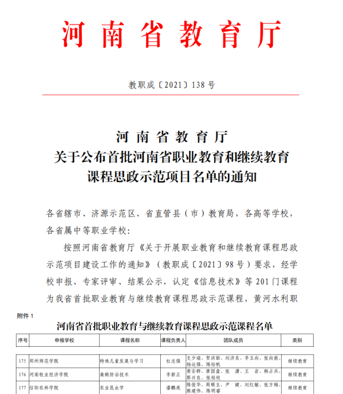 近日,教育厅公布了首批河南省职业教育和继续教育课程思政示范项目建设名单(教职成[2021]98号),我校李新正老师主讲的《禽病防治技术》课程名列其中,也是我校唯一入选河南省职业教育和继续教育课程思政示范课程。