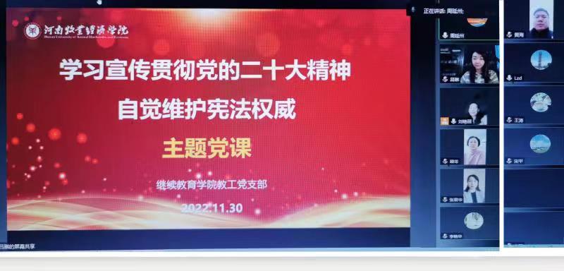 为认真学习宣传贯彻党的二十大精神,深入学习贯彻习近平法治思想,弘扬宪法精神,维护宪法权威,扎实推进宪法学习宣传和贯彻实施工作,11月30日下午,ok138cn太阳集团古天乐教工党支部以腾讯视频会议形式开展了“学习宣传贯彻党的二十大精神 自觉维护宪法权威”主题党课学习活动,会议由教工党支部书记吕琳主持,支部全体党员参加。