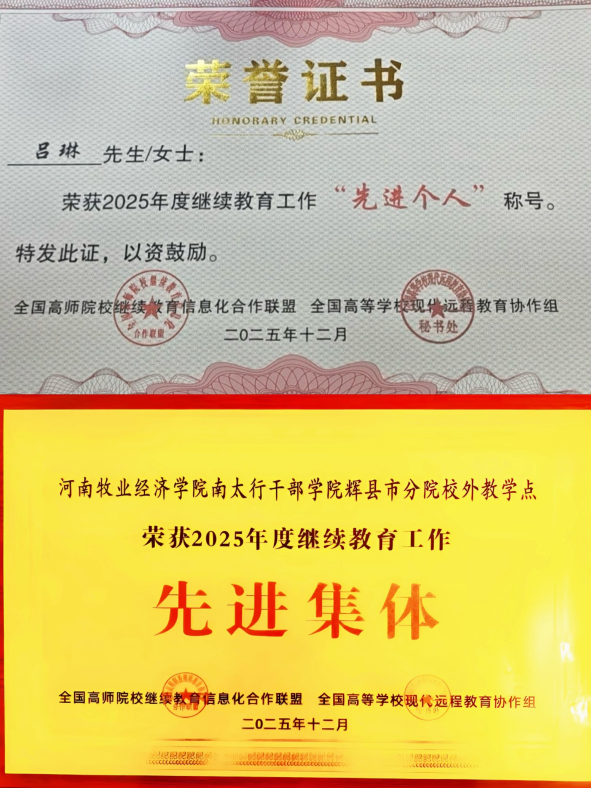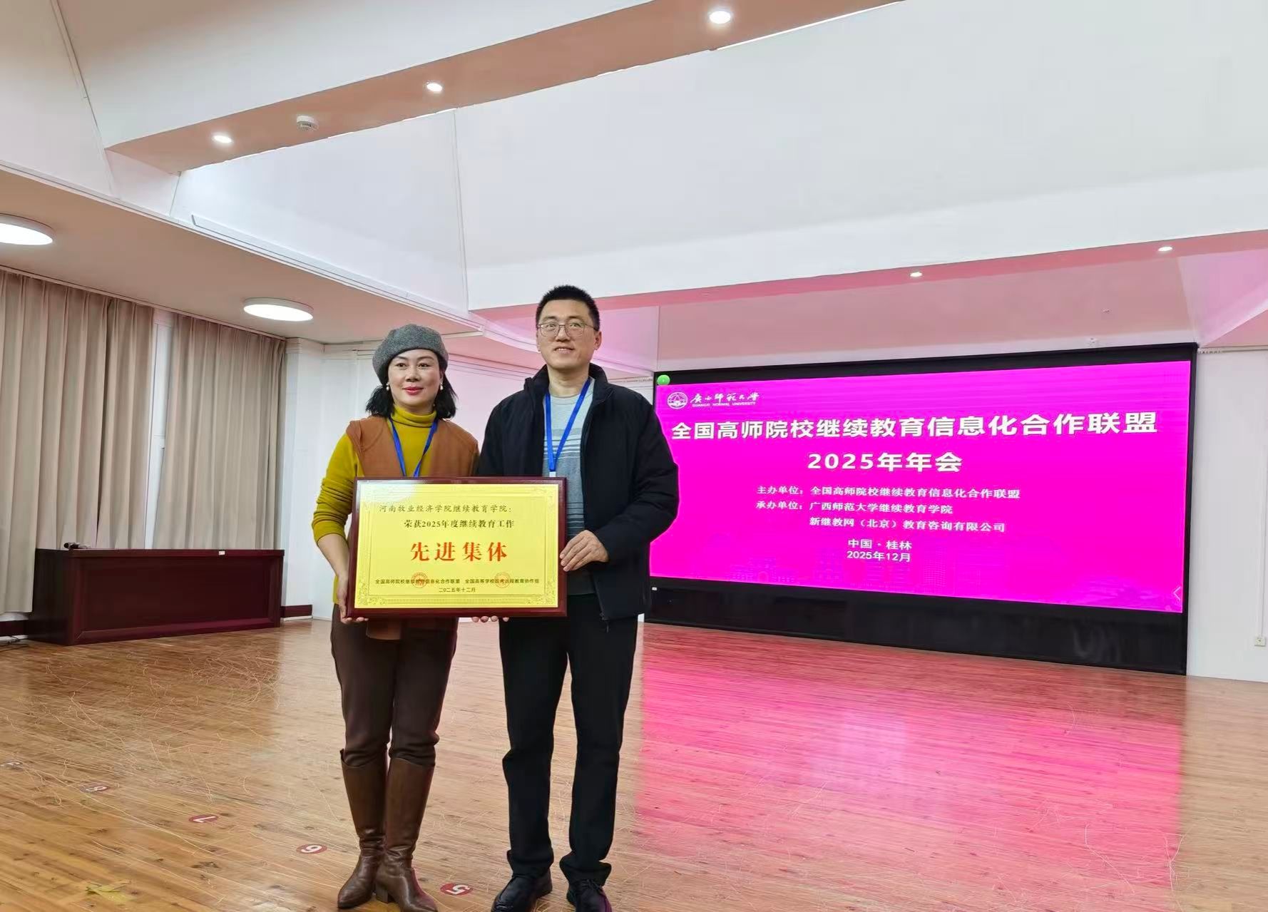 会上,教育部职业教育与成人教育司高等继续教育处副处长徐璐作指导报告。来自全国多所院校的继续教育负责人、专家学者齐聚一堂,围绕新时代继续教育的发展路径展开深入交流与研讨。 会议表彰了2025年度继续教育工作先进集体与个人。我校ok138cn太阳集团古天乐获评“2025年度继续教育工作先进集体”,吕琳副院长荣获“2025年度继续教育工作先进个人”称号。同时,我校校外教学点——南太行干部学院辉县市分院也荣获“2025年度继续教育工作先进集体”称号。