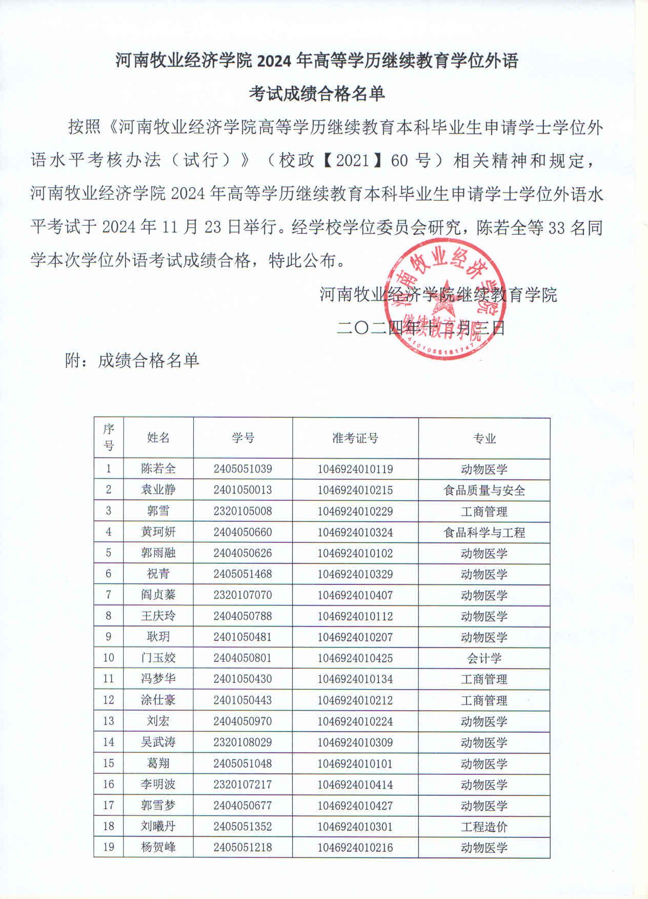 ok138cn太阳集团2024年高等学历继续教育学位外语考试成绩合格名单